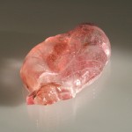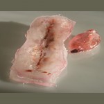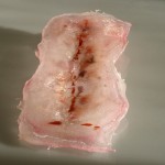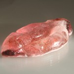 The imprint of a male chest is also made in kiln fired glass. But in isolation the body part has become abstracted and unrecognisable. Multiple firings and layers create a sense of looking through the body. A surface scar from a full length medical sternotomy sits deep within the cast as a red bloody line signifying a medical event – the trace of the knife, bruising of the body.